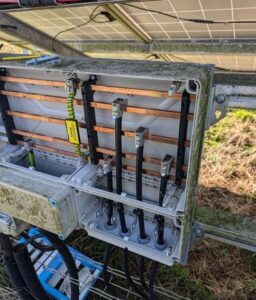 The old existing Danfoss FLX15 Pro inverters were daisy chained back to the Meteocontrol datalogger in RS485 data cable.  The new STP110-60 (CORE2) inverter used Ethernet TCP/IP data protocol, so we had to run a separate ethernet comms cable temporarily overground to the Meteocontrol datalogger and configure this to enable data flow for remote monitoring. We also needed to update the system configuration on the Meteocontrol VCOM portal. The client will subsequently dig a new trench and we will return to site to re-run Ethernet cable in a new underground duct.
